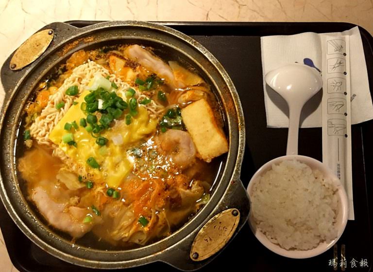 鍋裡的配料王子麵、起司外,還有:魚餃、燕餃、迷你的火鍋肉片、金針菇、蛋、豆腐、高麗菜、泡菜等,算起來給料的樣式與數量都不多,不過有附一碗白飯,一個人可以吃超飽的。