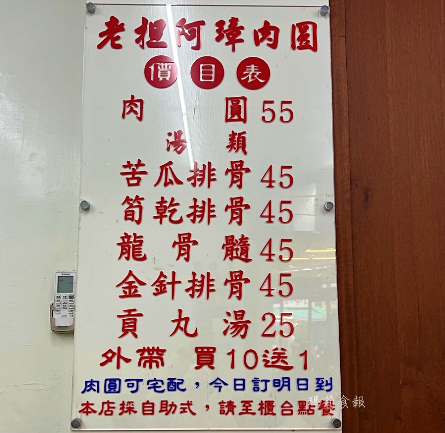 阿璋肉圓主打肉圓之外,還有:龍骨髓湯、金針排骨、筍乾排骨、苦瓜排骨、貢丸湯等湯品。外帶肉圓買十送一。