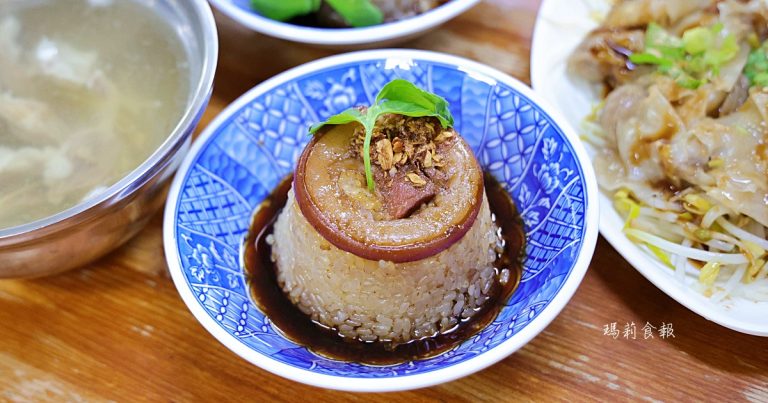 有別於常見的米糕造型,一圈肥肉蓋在米糕上真好像一圈天使光環的感覺,肥肉中間放了瘦滷肉及油蔥,米糕底下有獨門醬汁,模樣十分可愛討喜。