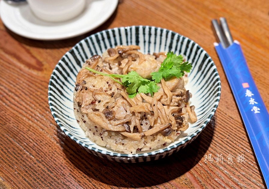 雖然是精緻迷你的小碗份量,但用料的確紮實:菇類給得大方、配有雞肉塊,加上紅藜麥油飯煮得很好,口感Q彈,溫潤濃郁的麻油香氣越嚼越香,整體的風味很有水準。