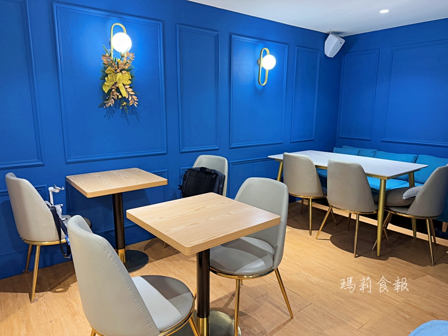 香緹果子咖啡館空間舒適明亮,以藍白色系打造的環境簡約有質感。店內有兩人座位,也有沙發區,座位間保持適當距離,來這裡享用下午茶特別自在。