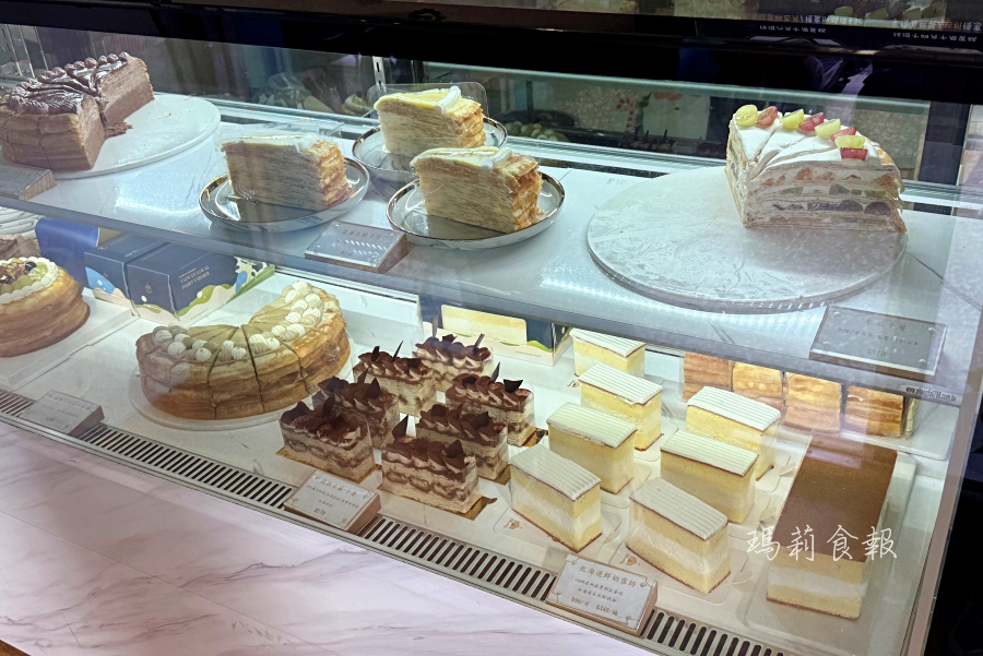 櫥櫃裡是每日新鮮製作的千層蛋糕、雪紡蛋糕、起司蛋糕,每款都好誘人。每天的口味數量有限,晚來熱門款可能就賣完囉。