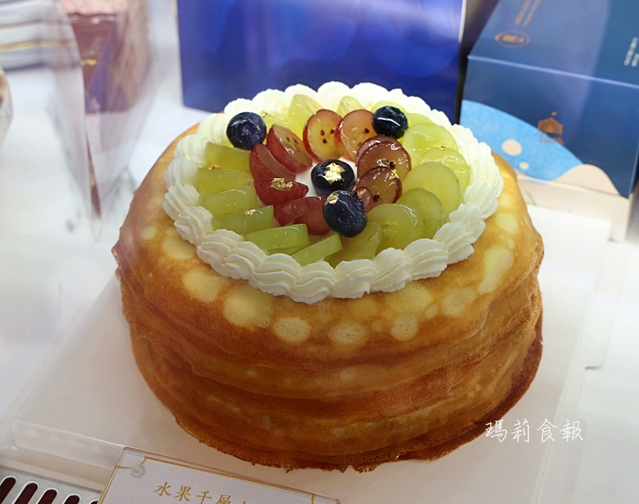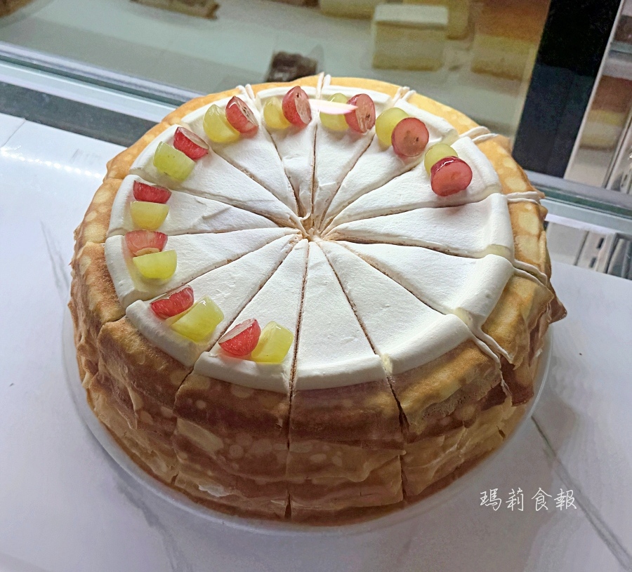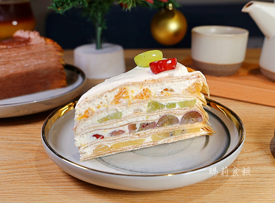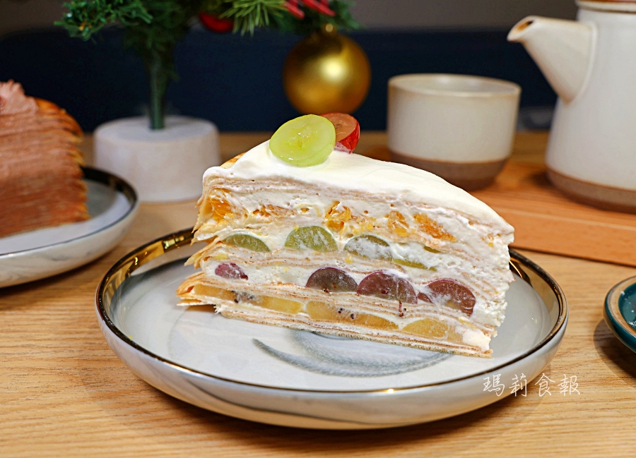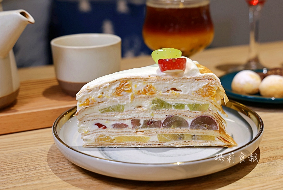 法式餅皮厚薄剛好,層層堆疊整齊漂亮,切面能看到紅葡萄、綠葡萄、蜜柑和奇異果交錯,光看就很療癒。