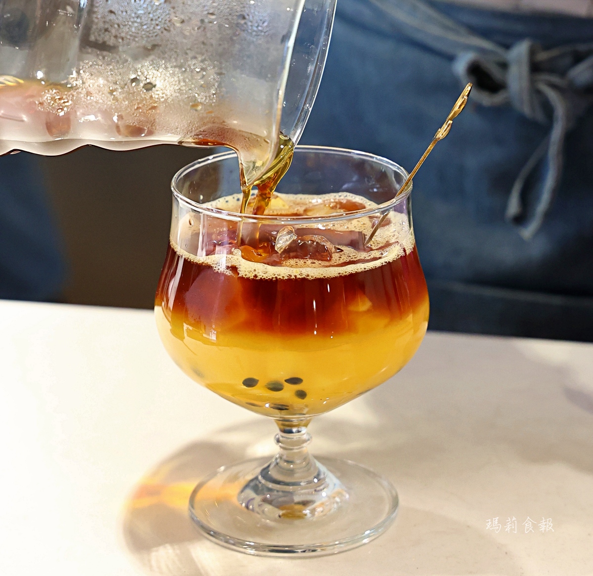 基底不是一般濃縮,是帶著清爽果酸的手沖耶加雪菲,再加上店家自熬的鳳梨、百香果與柳橙醬,漸層美得像把日出裝進杯子裡。