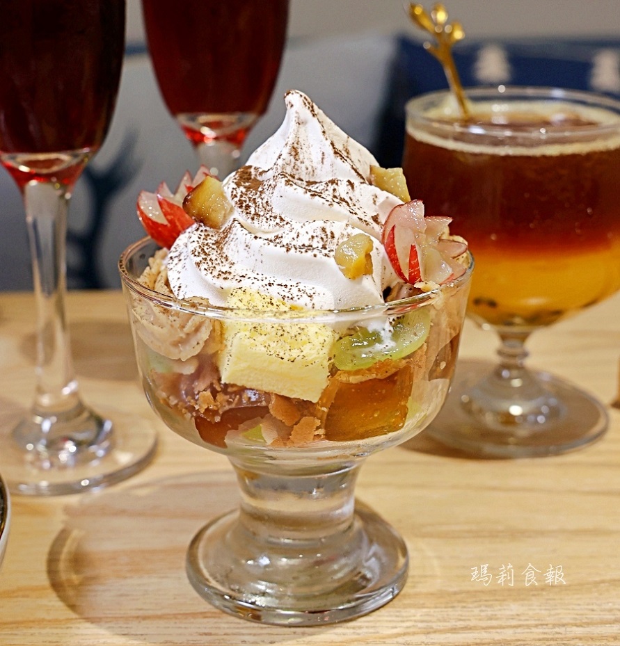 頂層是小農鮮奶霜淇淋,奶香濃郁,搭配秋季限定的栗子泥和新鮮葡萄,清甜又柔和;底層更有巧思:鬆軟的雪坊蛋糕、帶茶香的炭焙烏龍茶凍,以及 Q 彈滑嫩的古早味黑糖粉粿,每一口都能吃到多層次的台灣風味。