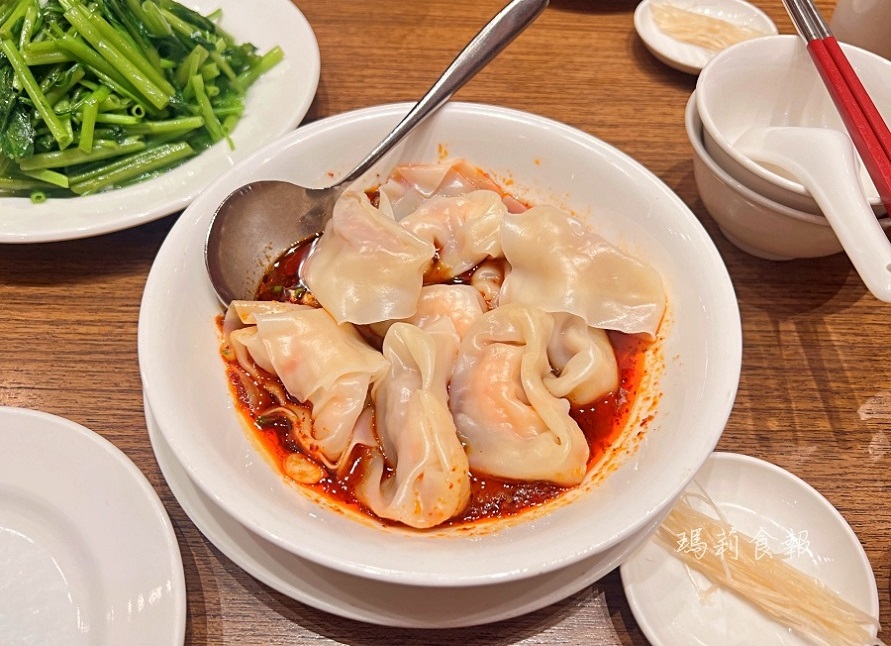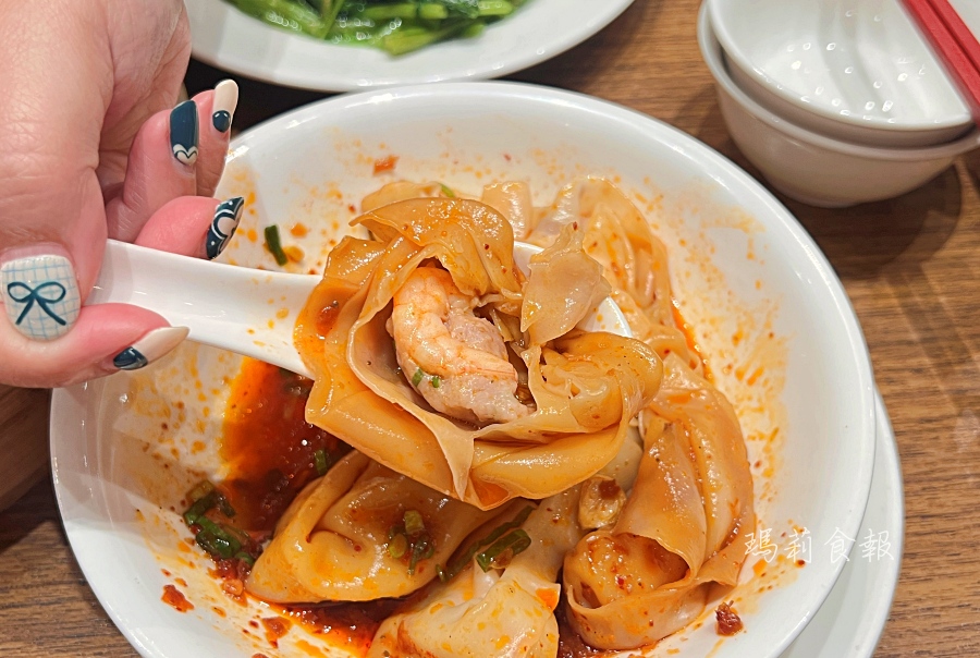 拌勻後再吃,麵皮薄透、紅油亮澤,咬下去竟然包著整尾蝦仁,搭配細切豬肉餡與特製紅油,鮮辣濃郁又超過癮。