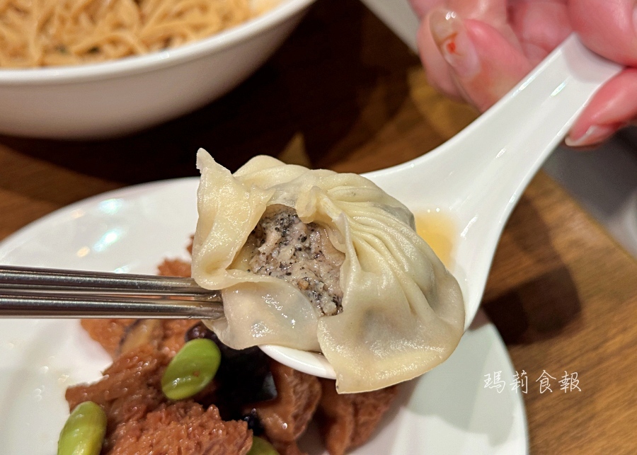 松露小籠包一咬下,香氣整個爆發,豬肉餡裡的松露黑點清楚可見,咀嚼間松露香氣與豬肉鮮甜交織,非常驚艷。一個雖然要 100 元,但真的很值得嚐鮮。