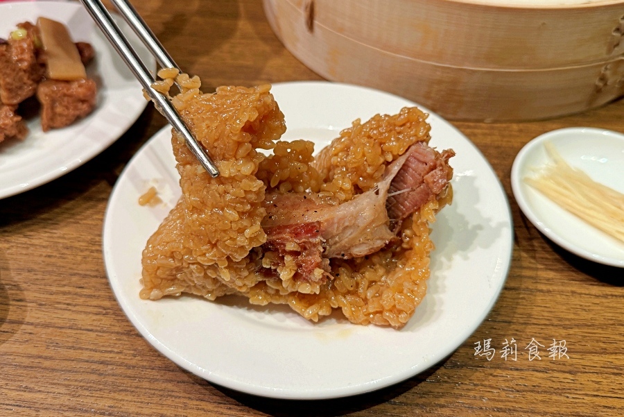鮮肉粽子是長形的經典湖州粽,糯米軟綿、五花肉鹹香入味,水煮後粽香四溢。咀嚼時糯米與五花肉融合,口感層次豐富,米香和肉香交錯,非常過癮。