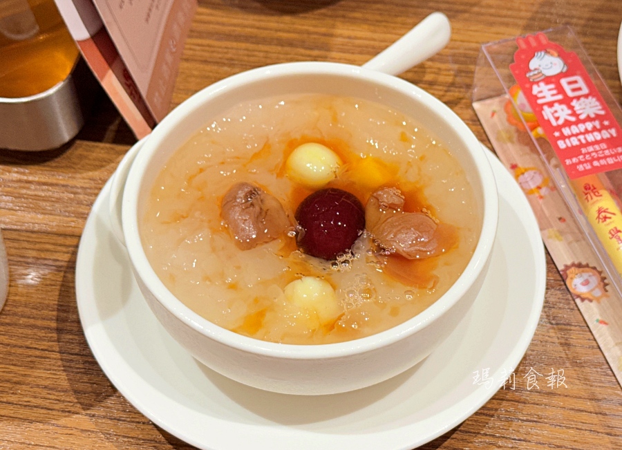 銀耳四寶甜湯冰涼清爽,銀耳滑嫩,搭配蓮子、紅棗、白果與桂圓,咀嚼時每種配料的口感都明顯,甜度剛好,最後一口喝下去整個用餐完美收尾。