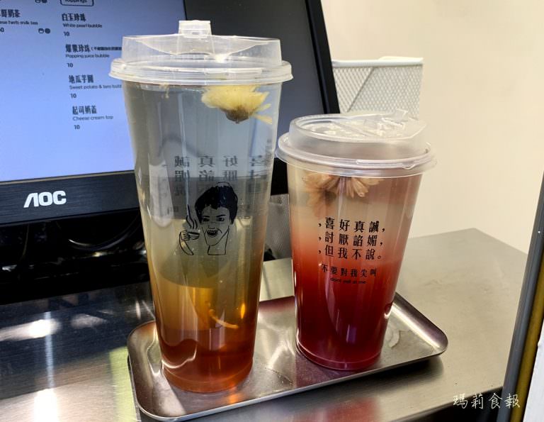 老茶、鮮奶茶、咖啡、氣泡飲與可可系列都有,價格落在40~60元間,屬於中等價位,加珍珠等配料需多加10元;珍珠有白玉珍珠、爆漿珍珠和地瓜芋圓三款,加起司奶蓋也是加10元就OK。