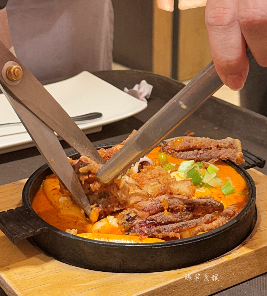 這道是經典的特色料理,鐵盤裡是一整尾炸魷魚,與被厚起司包裹的韓國年糕,香氣撲鼻。上桌時服務人員會先詢問要不要先拍照,然後會在桌邊將魷魚剪成方便入口的大小。
