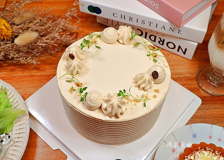 我們這款高顏質的韓系擠花系列蛋糕,尺寸是六吋,上頭的擠花款式是小清新感,戚風蛋糕是咖啡戚風,最後的內餡選了榛果碎與太妃糖奶醬。(蛋糕,務必提早3天預訂)