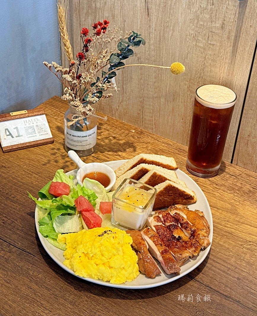 整體份量相當豐富的義式雞腿排早午餐!除了主角香煎雞腿排外,還有炒蛋、沙拉、烤吐司與手工優格,繽紛漂亮的餐點,光看就食指大動。