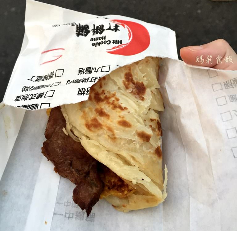 (為了拍照所以撕開紙袋)微焦的烙餅外皮一層層的超級香酥,又帶著Q彈的嚼勁,這可是店員用盡全身力量敲餅的效果(手工製作就是讚)