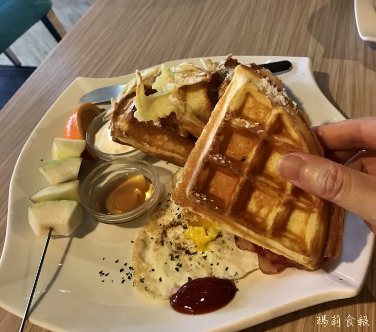 小可惜的是「荷包蛋」,蛋黃呈現九分熟,不是能讓鬆餅沾著吃的流動蛋液。