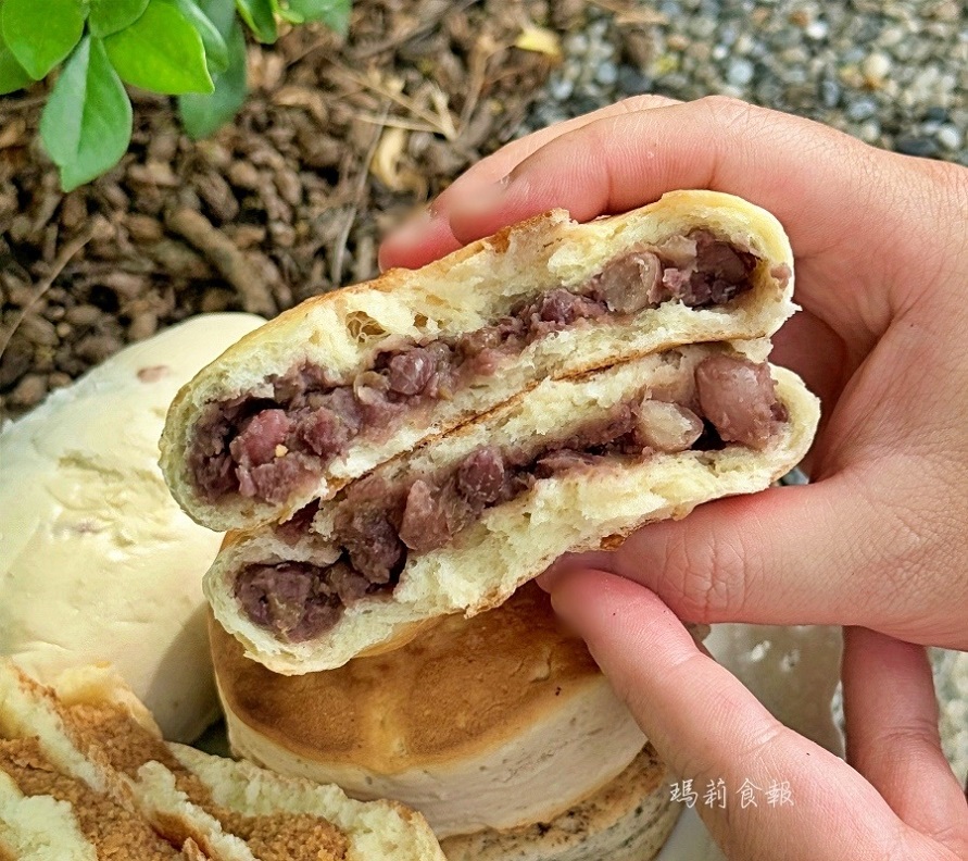 塊頭不小的紅豆餅,內餡飽滿紮實,QQ 鬆軟的手工餅皮裡包夾著紅豆顆粒與豆沙,好綿密香甜,層次感十足,扎實又耐吃。