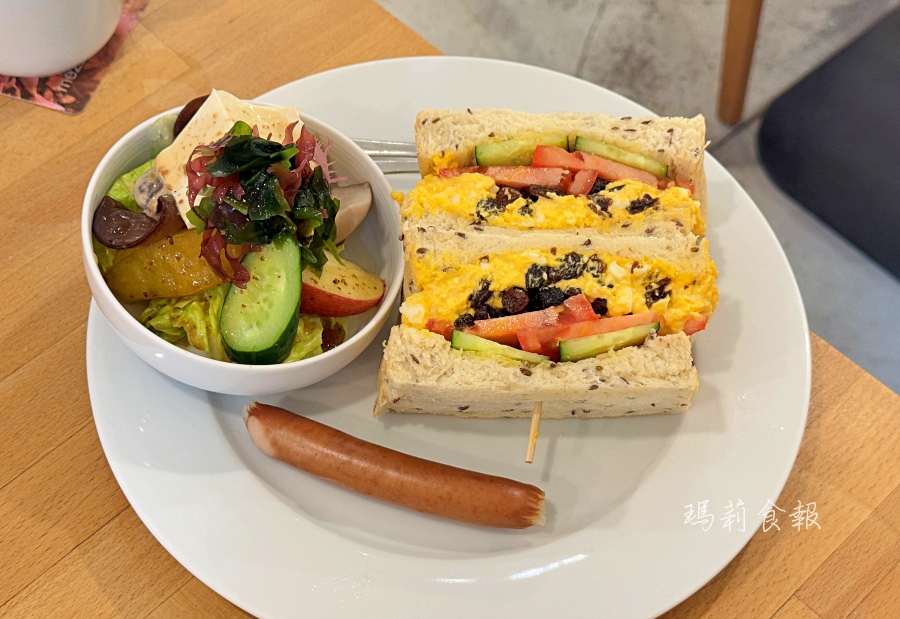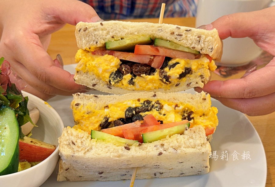 蛋沙拉三明治,加了紅藜麥的吐司裡包夾著新鮮的小黃瓜、牛蕃茄及吃的到蛋白小丁的雞蛋沙拉裡,雞蛋泥裡還有葡萄乾,微鹹裡浮現微甜是個讓我們眼睛一亮的小驚喜。