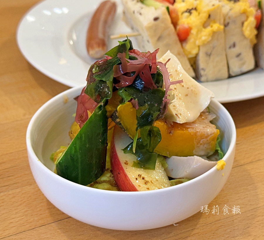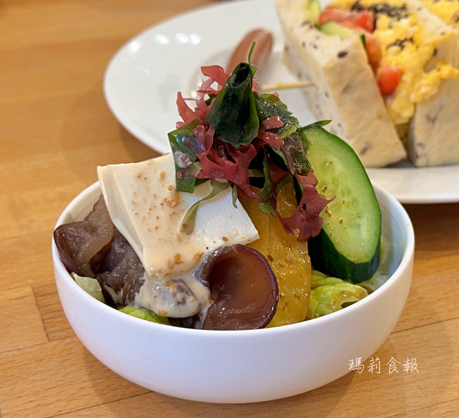 淋上芥末胡麻醬的生菜沙拉的份量不大,但種類超多,有豆腐、杏鮑菇、海菜、美生菜、番茄、蘋果、楊桃等,蔬果等,口味及口感都好豐富,好看好吃。