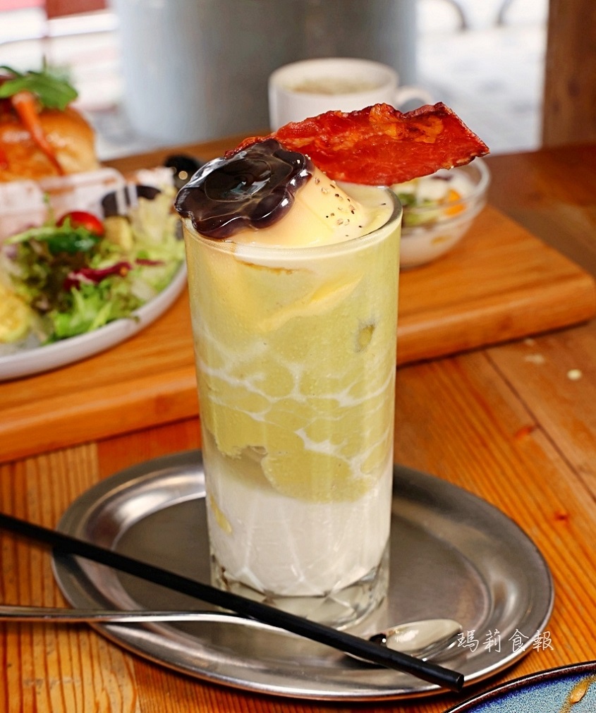 這杯頂著整顠布丁和香脆培根的培根布丁酪梨牛奶,超級吸睛、有創意!