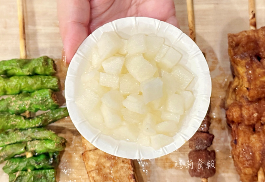 隨餐附贈可無限續的自醃蘿蔔,爽脆帶酸甜的漬蘿蔔,解膩開胃,跟串燒是好搭檔。