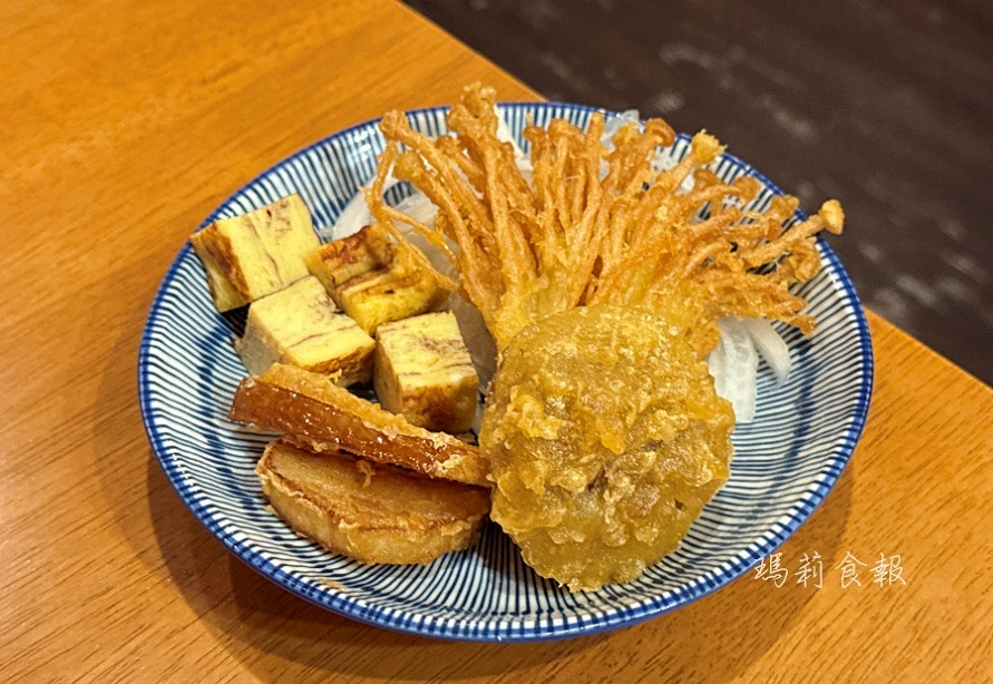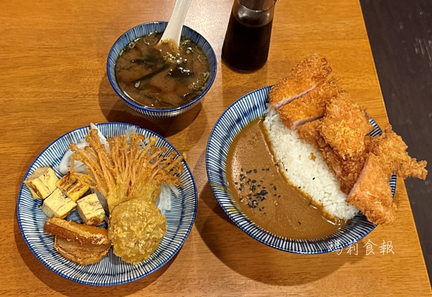 炸豬排咖哩附的炸蔬菜有香菇、金針菇、馬鈴薯、地瓜與玉子燒等,油瀝得很乾,吃起來脆香爽口,好涮嘴。