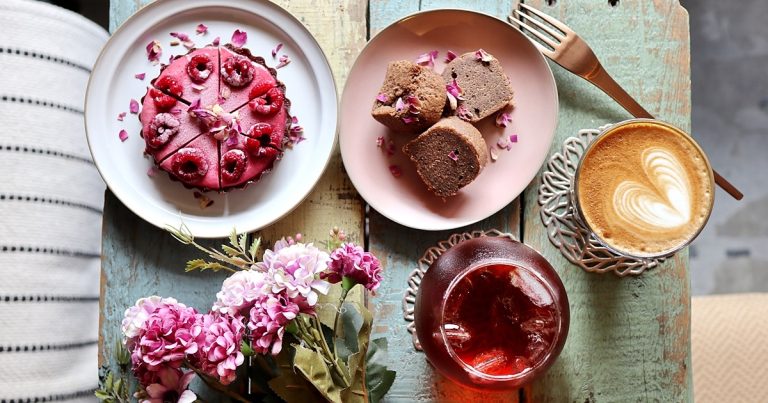 底下的巧克力塔皮是脆香微甜,上層的覆盆子甜中帶點酸香,搭著上的食用花一起吃,花香與果相的層次很棒唷!炎炎夏日,來份酸甜冰涼的水果塔類,涮嘴又舒湖~