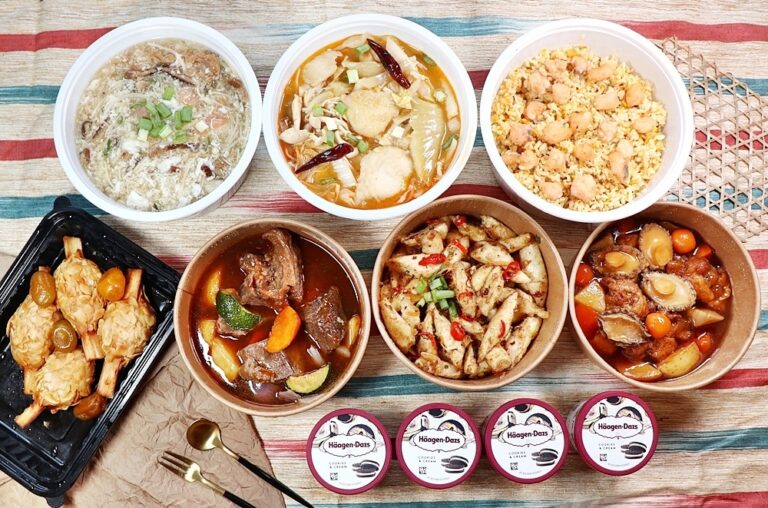 外帶合菜防疫餐,有:紅燒鮑魚扣虎掌、義式香草燉牛頰、鱗片蔗蝦、干貝XO美人腿、主廚金湯酸菜魚、蒜香帶子海鮮羹、鮭魚黃金蛋炒飯,再加上哈根達斯冰淇淋,六菜一湯一甜點,經典菜色的精銳盡出。