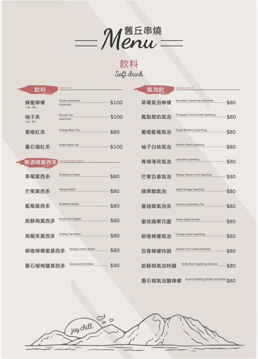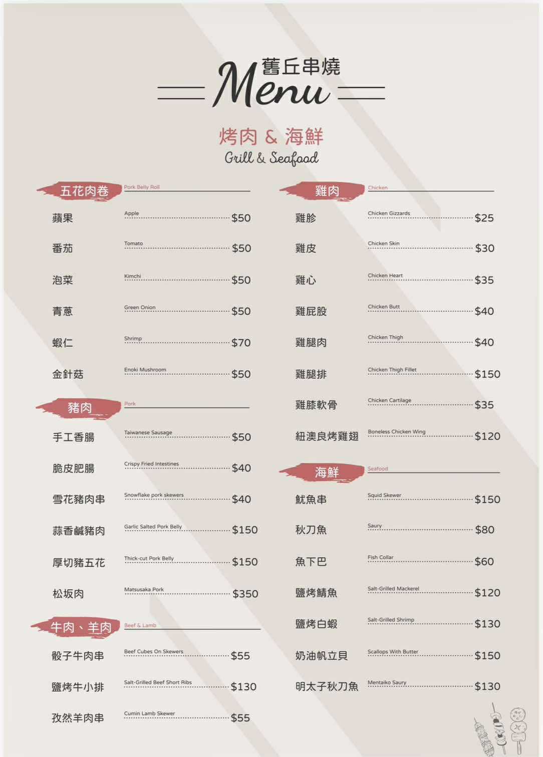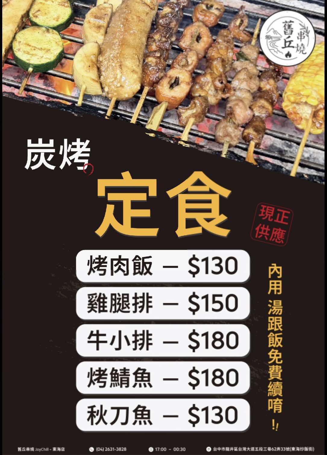 舊丘串燒東海店的營業時間從 17:00 到凌晨 12 點,晚上想吃串烤超方便。外帶或內用,只要說「看瑪莉食報文章來的」就享九折優惠;懶得出門還能直接叫 Foodpanda,在家也能吃到舊丘的好滋味。