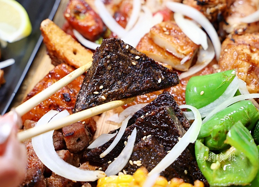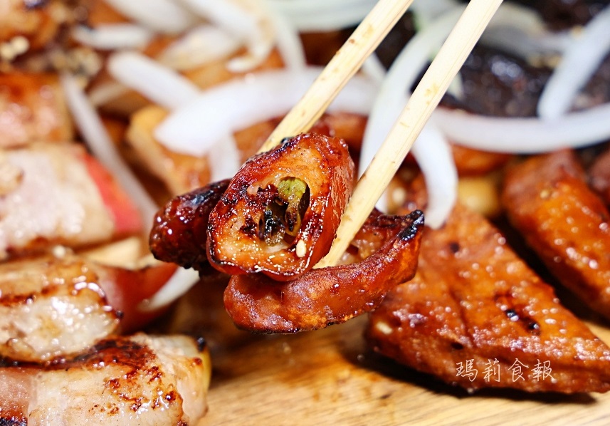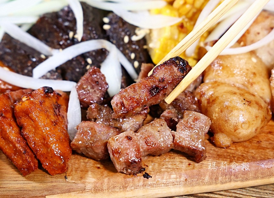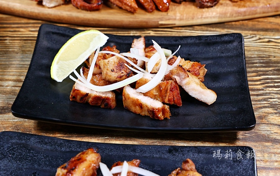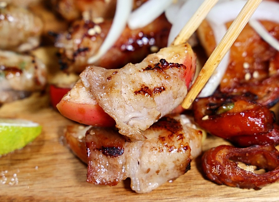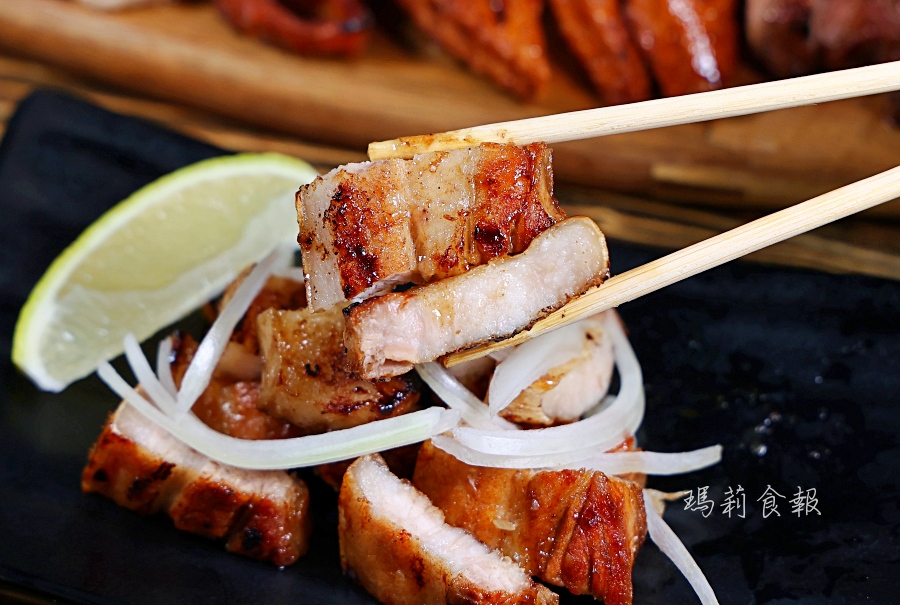 厚切豬五花經過火烤,油脂完全逼出,表面烤得焦香誘人,搭配獨家烤肉醬,香脆肥嫩越嚼越香。
