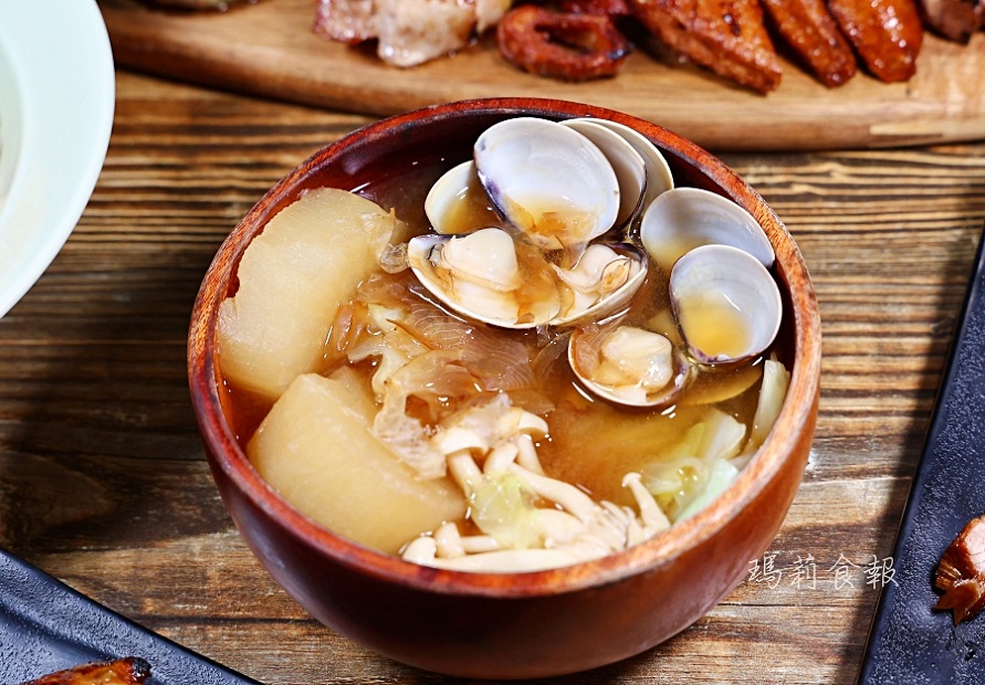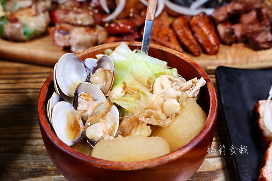 大根味噌蛤蠣湯裡有肥美的蛤蜊、白蘿蔔、鴻禧菇、秀珍菇、高麗菜、柴魚等,滿滿一碗都是料,味噌湯頭鮮美又帶食材自然甘甜,順口好喝,搭配燒烤超對味。