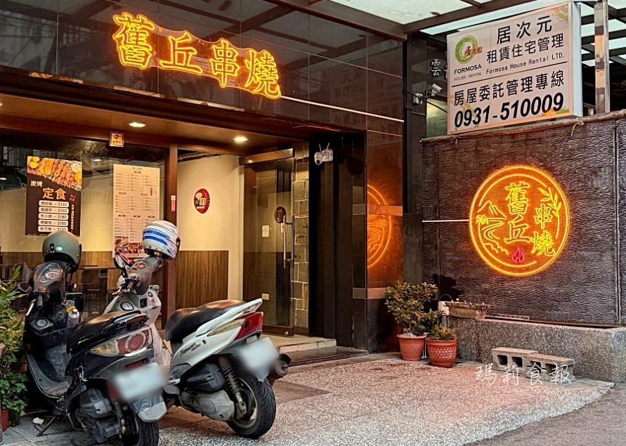 舊丘串烤 東海店位在東別商圈裡,從台灣大道五段 3 巷進來後直走,看到跟新興路分叉的「62弄」,也就是被暱稱為「東海炒飯街」這條,轉進後往裡騎約一分鐘就能看到店前大大的舊丘霓虹燈招牌,非常顯眼好找。