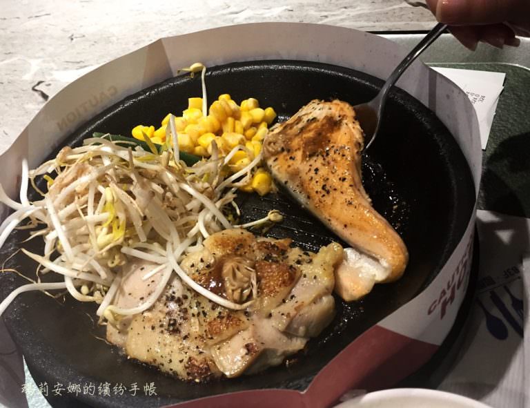 主餐是鮭魚與雞排,搭配玉米、豆芽菜、豆子等配菜,同樣附一碗白飯。