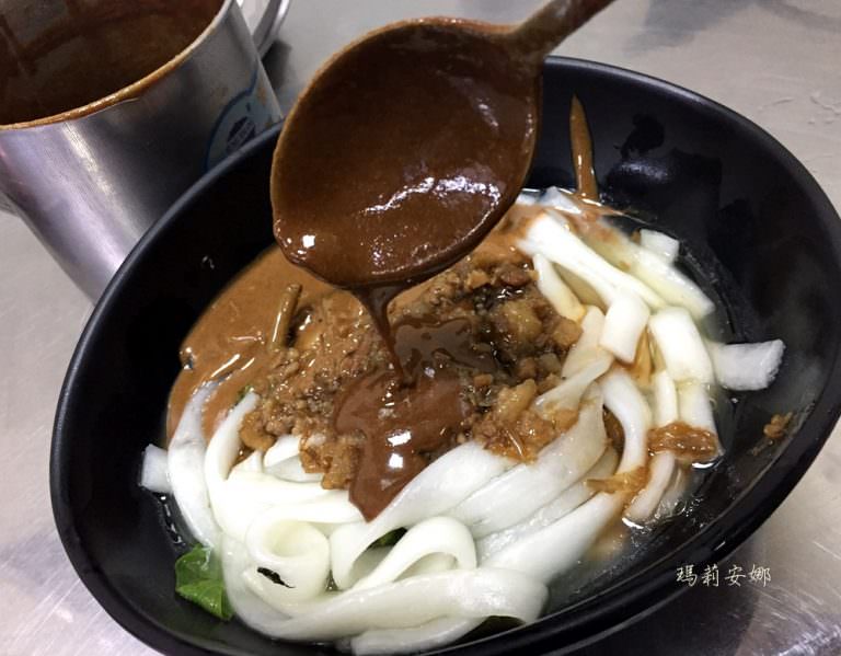 板條的口感好Q,小有嚼勁,我個人覺得一樣的「一麵三吃」,板條大勝切仔麵!應該是有嚼勁的板條需要在口中咀嚼較多的時間,讓三種醬料有足夠的時間,在口腔裡與板條均勻的結合,讓香氣有機會發展到最顛峰、極致的關係吧!