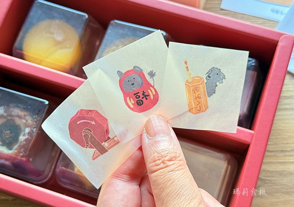 和果子、羊羹襯底的和紙上,印著旬食店犬「庫里」等多款插畫,萌度滿分,小細節裡藏著幽默的巧思。