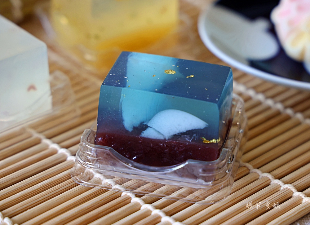夜空靈感的星空羊羹,上層蝶豆花寒天凍與白色牛奶銀河,底層紅豆沙大地,金箔、銀箔點綴如小星星。入口柔Q,紅豆牛奶甜香搭配蝶豆花清雅,夢幻又溫暖的味覺享受,彷彿一口就吃進整片夜空。