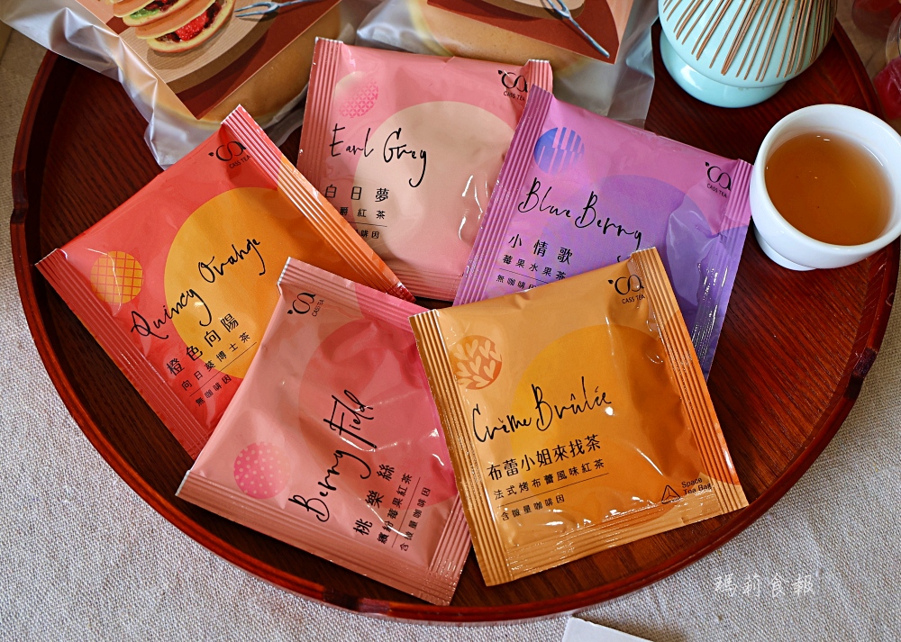 綜合德國花草茶有:桃樂絲(繽紛莓果紅茶)、布蕾小姐來找茶(法式烤布蕾風味紅茶)、白日夢(伯爵紅茶)、小情歌(莓果水果茶)、橙色向陽(向日葵博士茶)等五種口味。