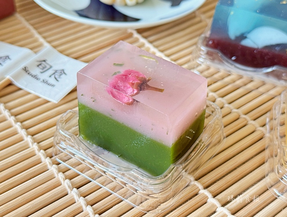 櫻花抹茶羊羹的上層寒天凍搭配鹽漬櫻花與櫻花葉,底層是抹茶羊羹。細膩口感中帶著淡雅花香和抹茶茶香,每一口都能感受到層次的變化,視覺與味覺都讓人滿足。