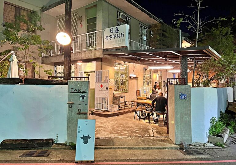 TAKU 牛丼專賣店位在民生北路和向上北路交叉口,門邊柱上有以鋼筋燒焊TAKU的店名招牌、營業中會搬出繪有牛頭的立牌,然而老宅前身的日鑫印刷行招牌比TAKU的招牌更為顯眼就是了。