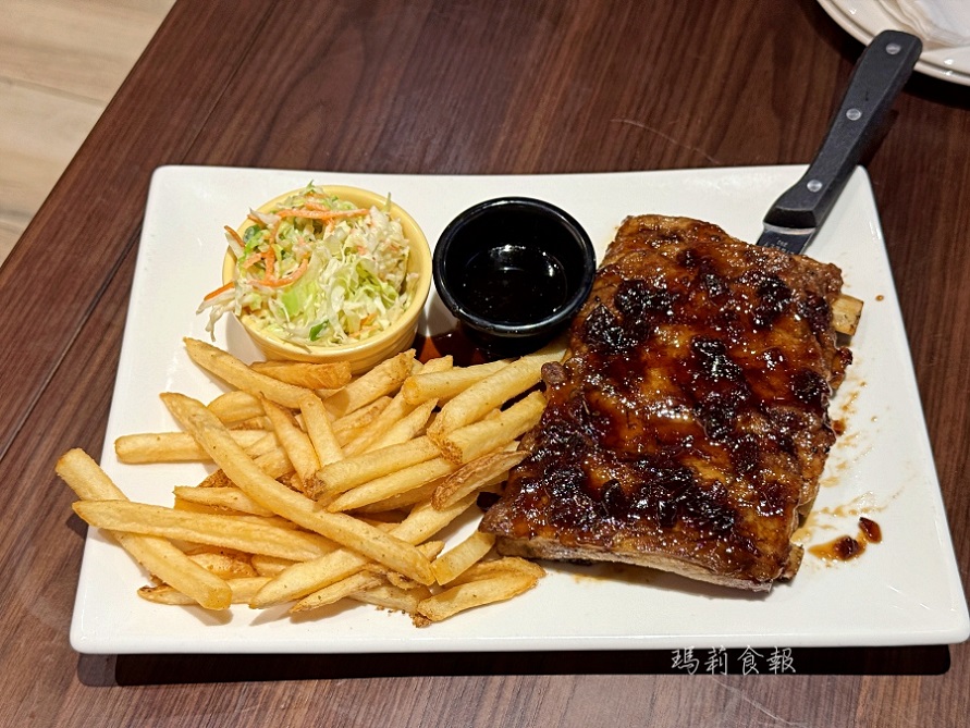 肋排慢火炭烤至焦香入味,表層刷上獨家的BBQ 醬帶出甜香,焦糖化的洋蔥與醬汁完美融合,肉質香嫩多汁,咬下去滿嘴都是濃厚肉香。隨盤附的涼拌捲心菜,中和了肋排的厚重感,好清爽解膩。