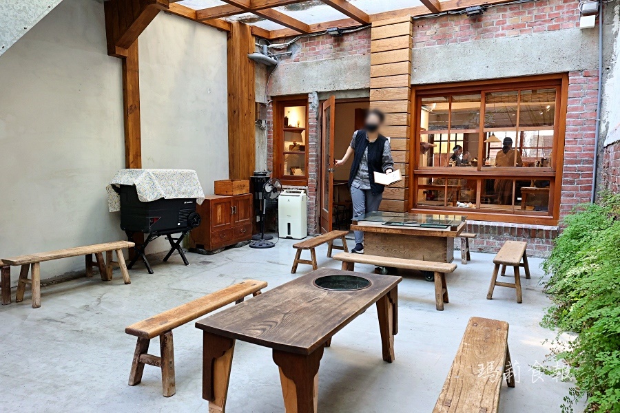 兩張過去是燒烤爐、暖爐的改成的桌子,加上長椅寮圍繞的座位,擺放其中,讓空間多了份懷舊韻味。