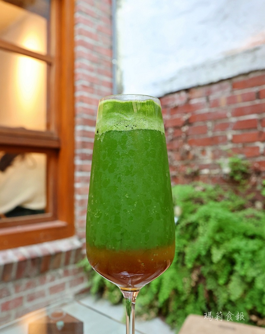 抹茶氣泡飲,用高腳透明玻璃杯裝著,可以很清楚的看到上面的抹茶飲及底層的自製檸檬糖漿,飲料漸層色澤好漂亮。攪拌均勻後再喝,入口時可以明顯感受到抹茶微苦香韻,也襯出檸檬糖漿的酸甜馨香,以及微微的氣泡感,層次豐富、比例平衡,清雙沁涼獲得我們一致的讚美。